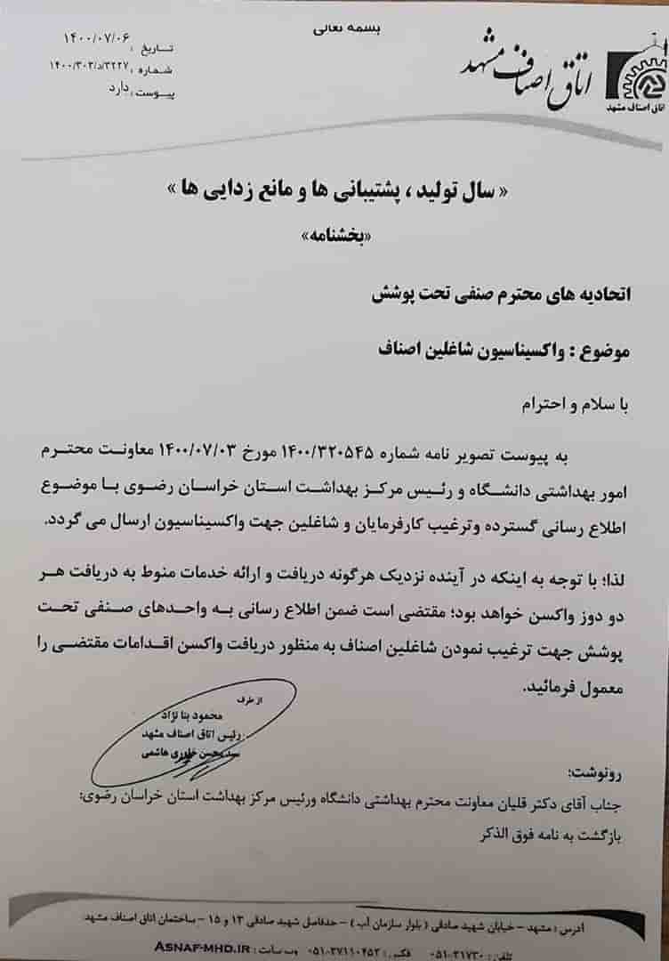 موضوع : واکسیناسیون شاغلین اصناف