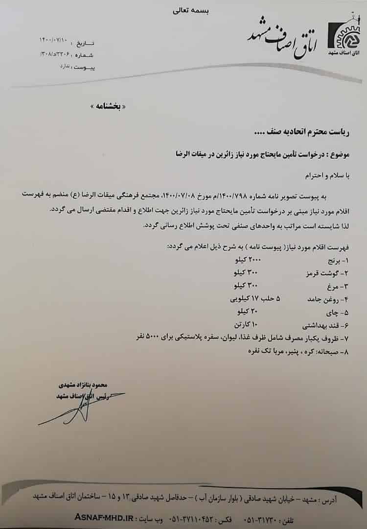 موضوع : درخواست تامین مایحتاج موردنظر زائرین در میقات الرضا